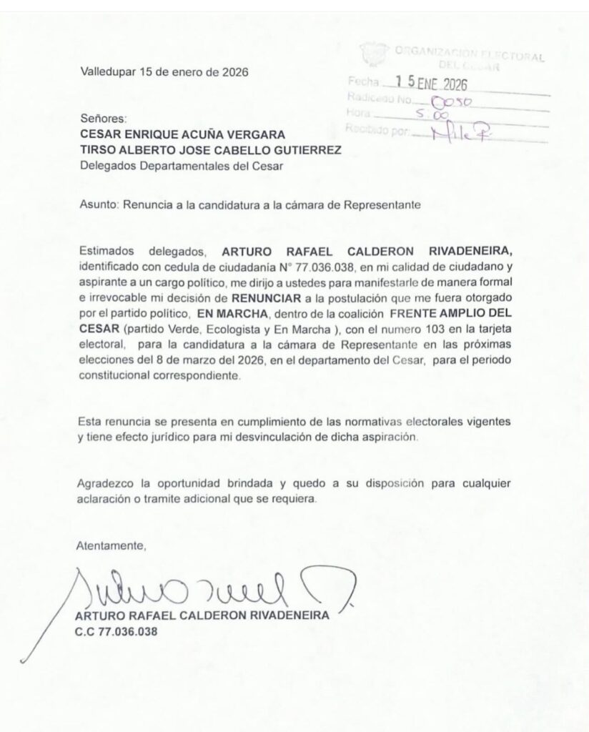 La lista del Frente Amplio a la Cámara de Representantes por el Cesar sufrió este jueves un golpe político significativo tras la renuncia formal e irrevocable de Arturo Rafael Calderón Rivadeneira a su candidatura para las elecciones legislativas del próximo 8 de marzo de 2026.